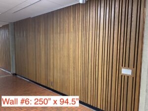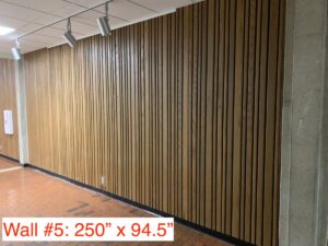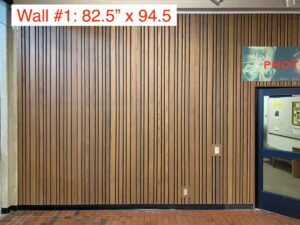 - (1) 7’ wall with slated wood paneling (ceiling wire hanging mechanisms for display)
